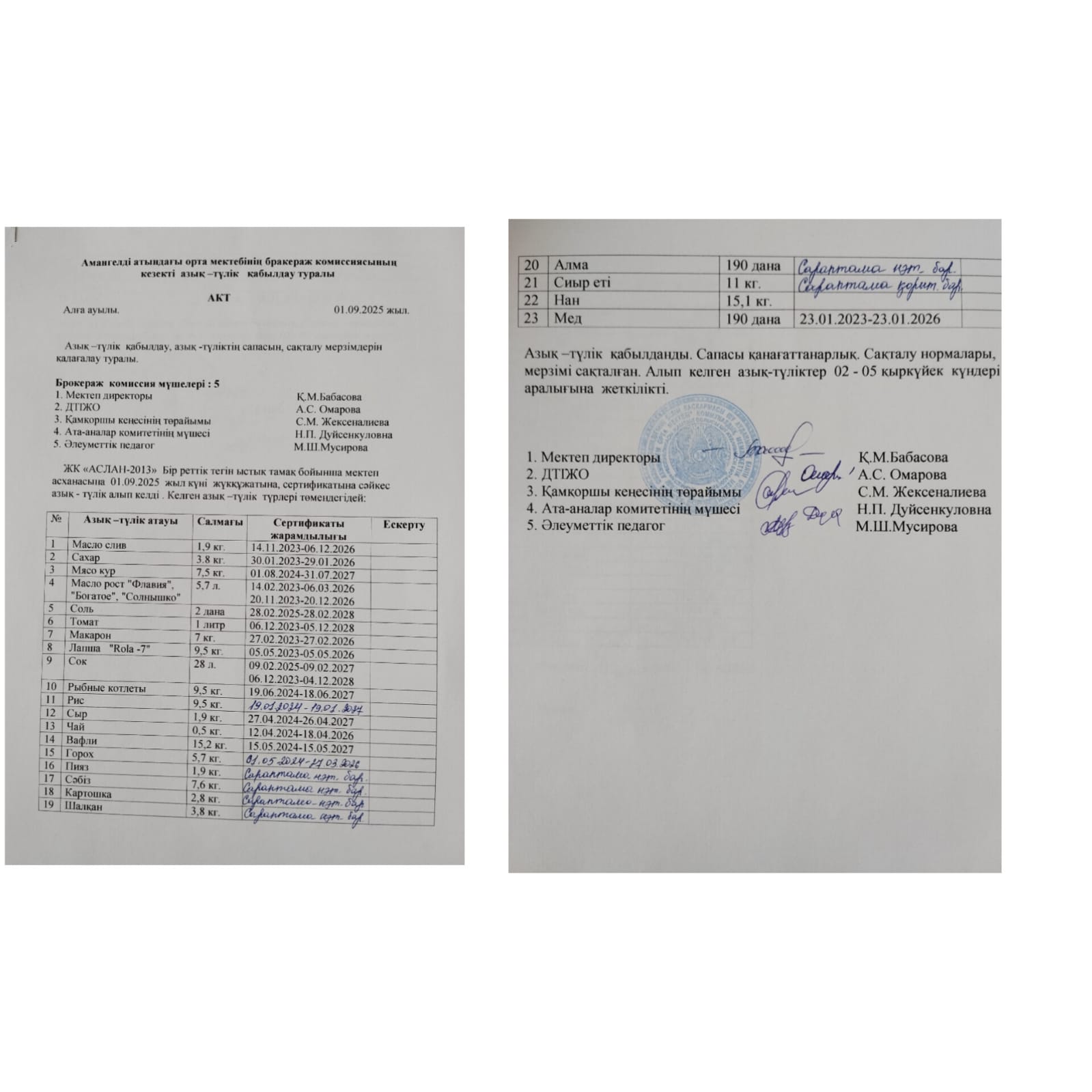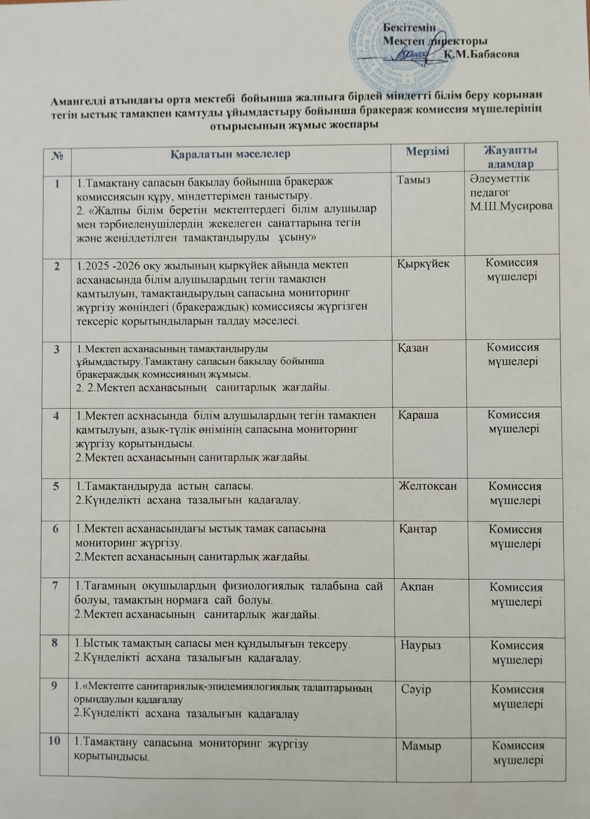 2025-2026 оқу жылында мектепте ыстық тамақпен қамтуды ұйымдастыру бойынша бракераж комиссия мүшелерінің отырысының жұмыс жоспары