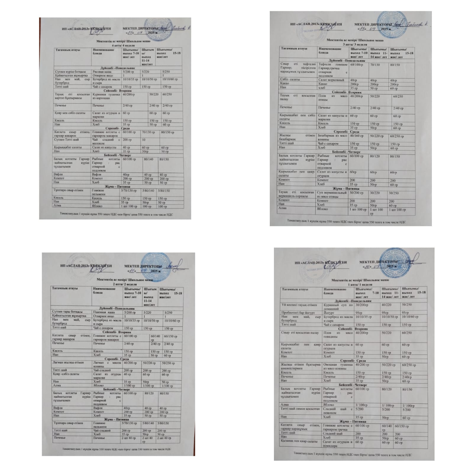 ЖК "АСЛАН-2013" мен келісілген балалардың жас ерекшеліктеріне қарай жасалған мектеп асханасында берілетін ыстық тамақтың төрт апталық Ас мәзірі