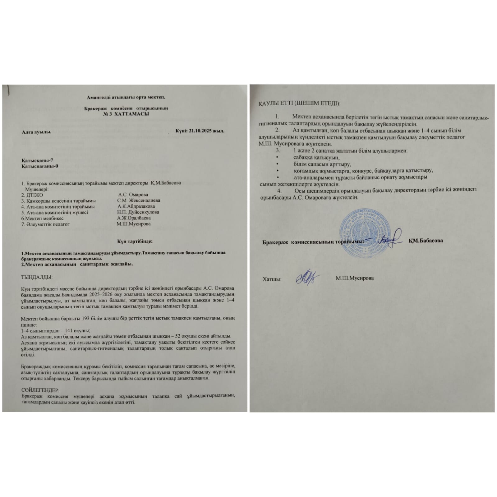 Қорытындылай келе, қараша айында бракераж комиссиясының жұмысы жүйелі жүргізіліп, мектеп асханасында оқушыларды сапалы және қауіпсіз ыстық тамақпен қамтамасыз ету толық деңгейде орындалды.