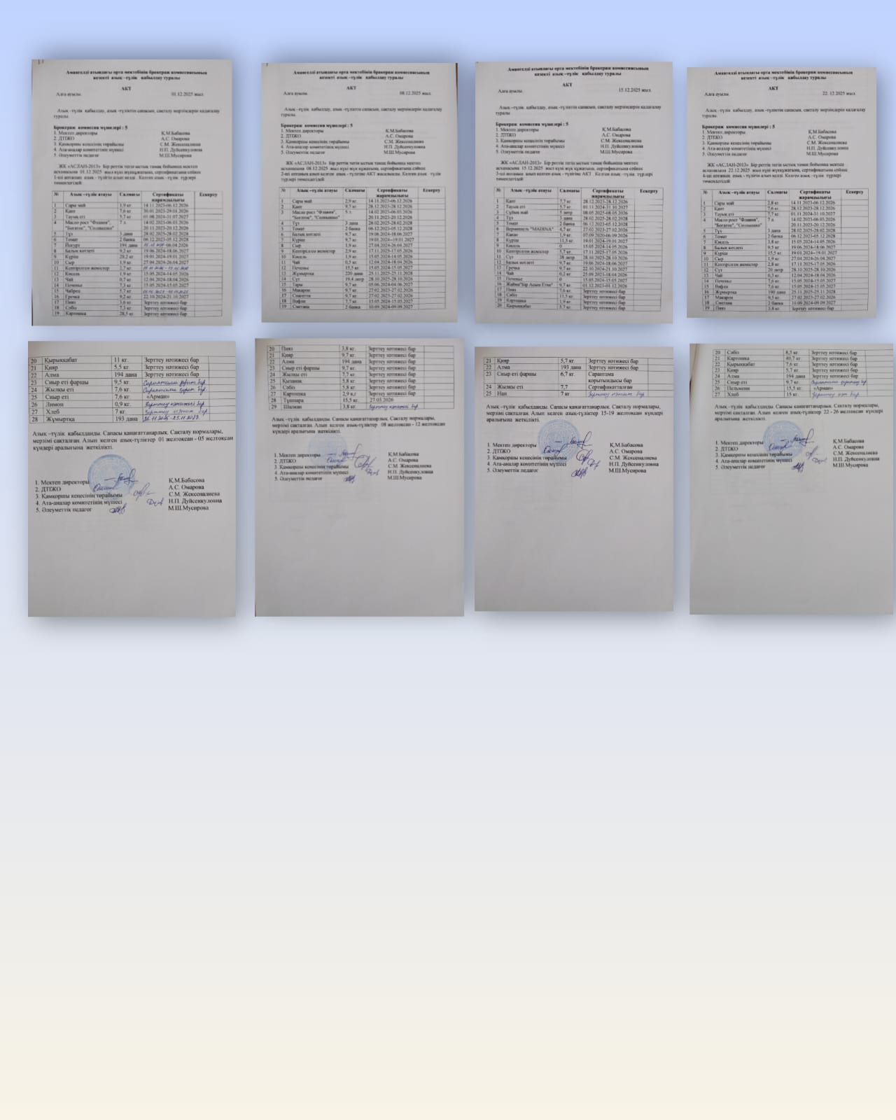 Амангелді атындағы орта мектебінде тамақтандыруды ұйымдастыру және тамақ сапасына бақылау жүргізу бойынша құрылған бракераж комиссиясының мүшелері, 2025 жылғы желтоқсан айына арналған бір мезгіл ыстық тамақтың төрт апталық бекітілген ас мәзіріне сәйкес жеткізілген азық-түлік өнімдерін қабылдау мақсатында акт жасады.